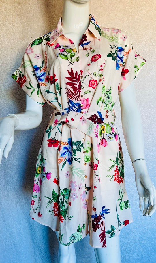 Floral Print Wide Shoulder And Drop sleeve dress with belt